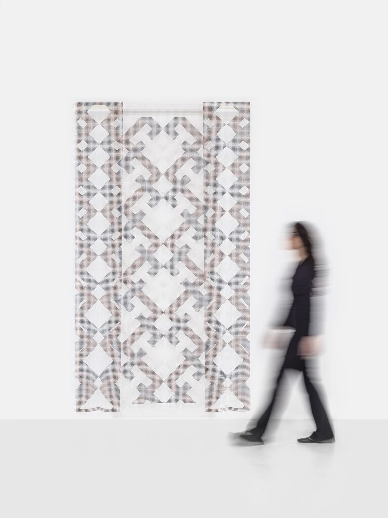 Bonolo Kavula was born in 1992 in Kimberley, South Africa, and currently lives and works in Cape Town, South Africa. She explores the language of printmaking beyond its traditional confines through her use of thread and punched shweshwe fabric as an exercise of abstraction.