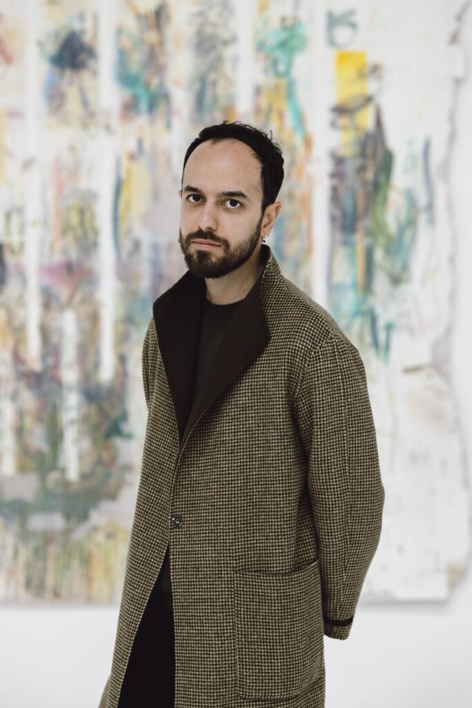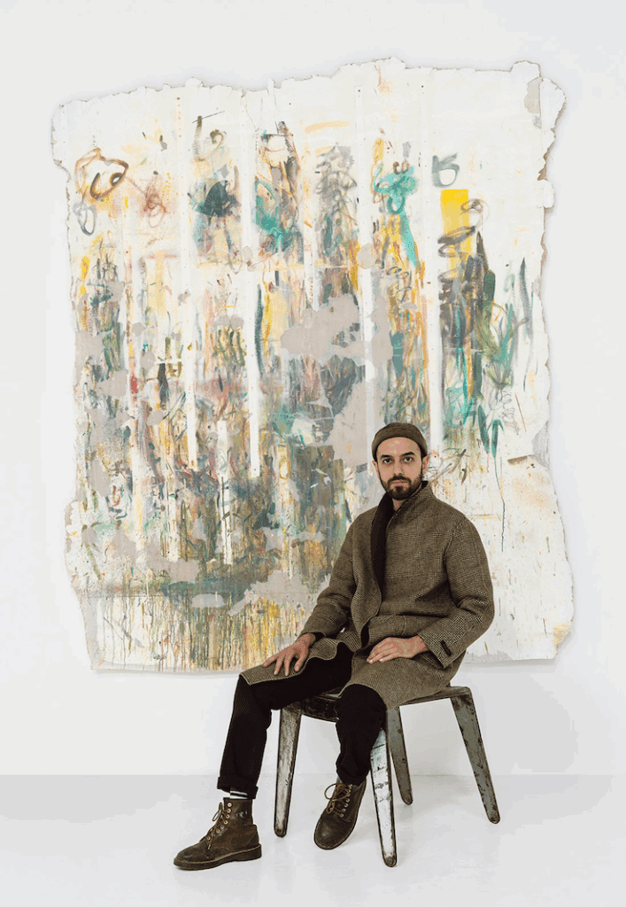 The artist’s interest in text, particularly Arabic script and calligraphy, has become an explorative means to study the nature of mark-making and the cultural complexities that often arise through translation. Script carries our collectively imposed meaning but also a multitude of intuitive translations, as well as an innate aesthetic of form and shape. This is embodied through the additive act of layering in Bineshtarigh’s works, with the artist utilising canvas, ink, pencil, shards of glass, glue, or layers of paint extracted from the very walls of his studio. He frequently works on an immersive scale, creating site-specific installations that are arresting in their capacity to envelope the viewer.